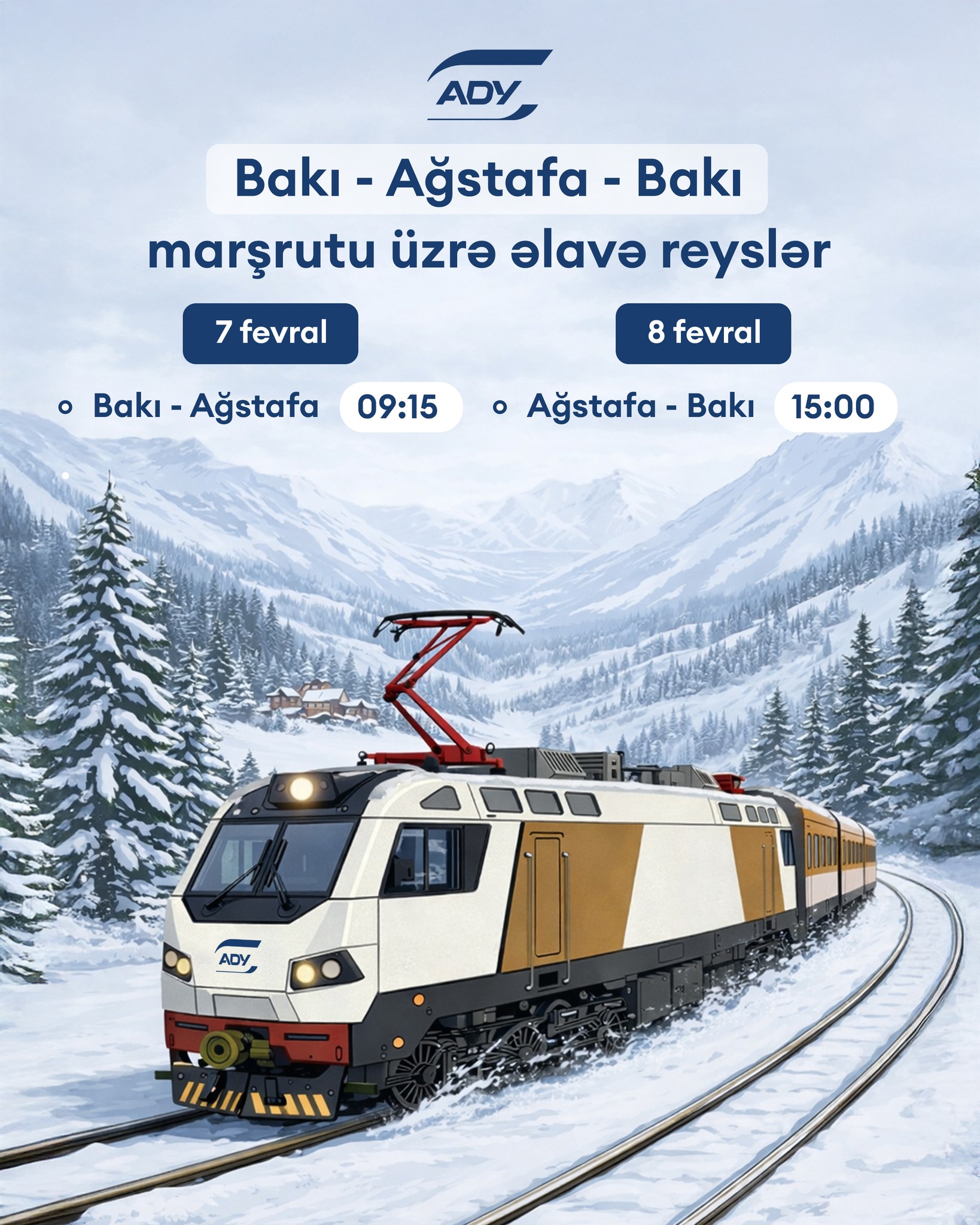 Artan sərnişin tələbatını təmin etmək məqsədilə 7-8 fevral tarixlərində Bakı-Ağstafa-Bakı istiqamətində əlavə qatar reysləri təyin edilib.
