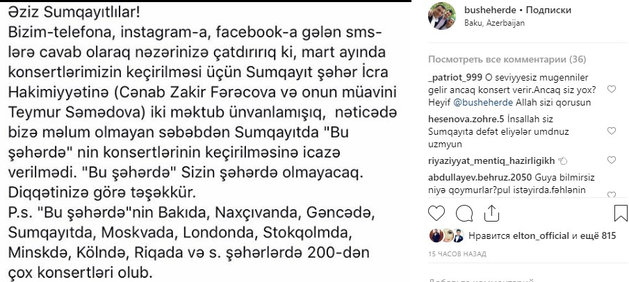 “Bu şəhərdə”in Sumqayıtda konsertinə icazə verilməyib. “Qafqazinfo” xəbər verir ki, onlar bu barədə instaqram səhifələrində məlumat yayıblar.
