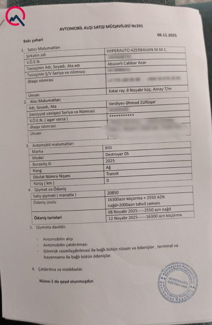 “Hyperauto Azerbaijan” şirkəti mənə qarşı xaricdən maşın gətirmək adı ilə dələduzluq edib. Ötən il noyabrın 8-də “BYD Destroyer” avtomobili üçün 18 850 AZN ödəniş etsəm də, ortada nə maşın var, nə də pulumu qaytarırlar”.