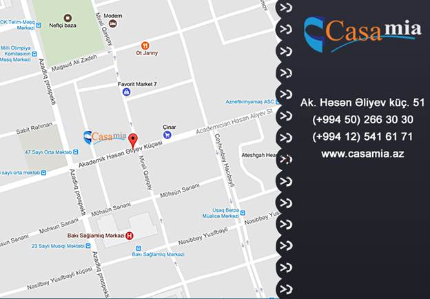 Casamia - da əldə edilən santexnika, sauna, hamam aksesuarları, keramika, çilçıraqlar, otaq arası və giriş qapıları, divar kağızları və digər interyer elementləri dəbli və zərif zövqün nümunəsi olacaq.