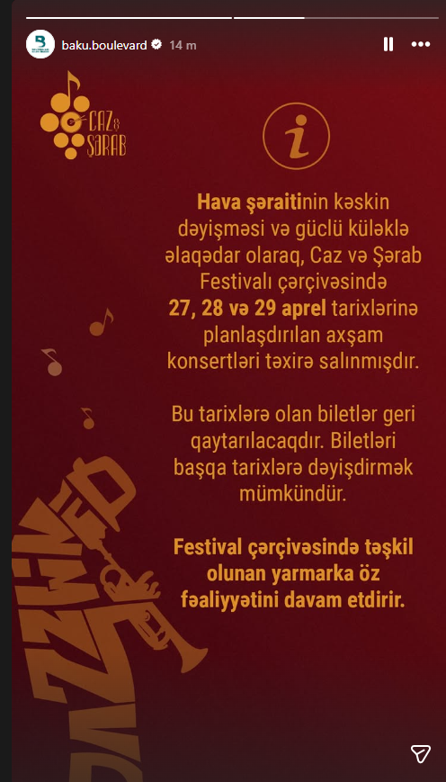 Hava şəraitinin kəskin dəyişməsi və güclü küləklə əlaqədar olaraq, Caz və Şərab Festivalı çərçivəsində 27, 28 və 29 aprel tarixlərinə planlaşdırılan axşam konsertləri təxirə salınıb.