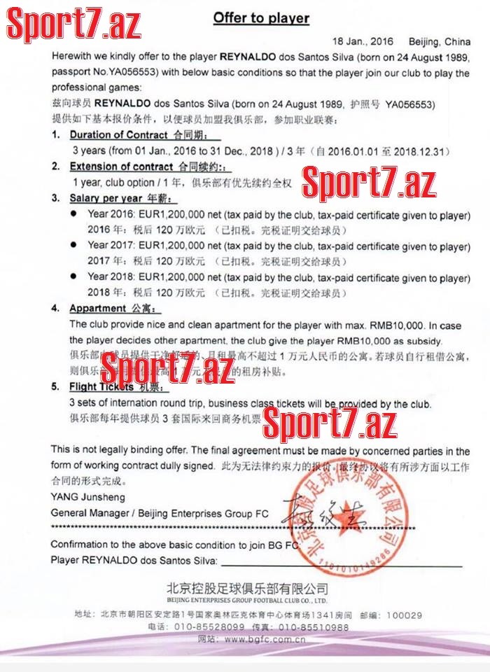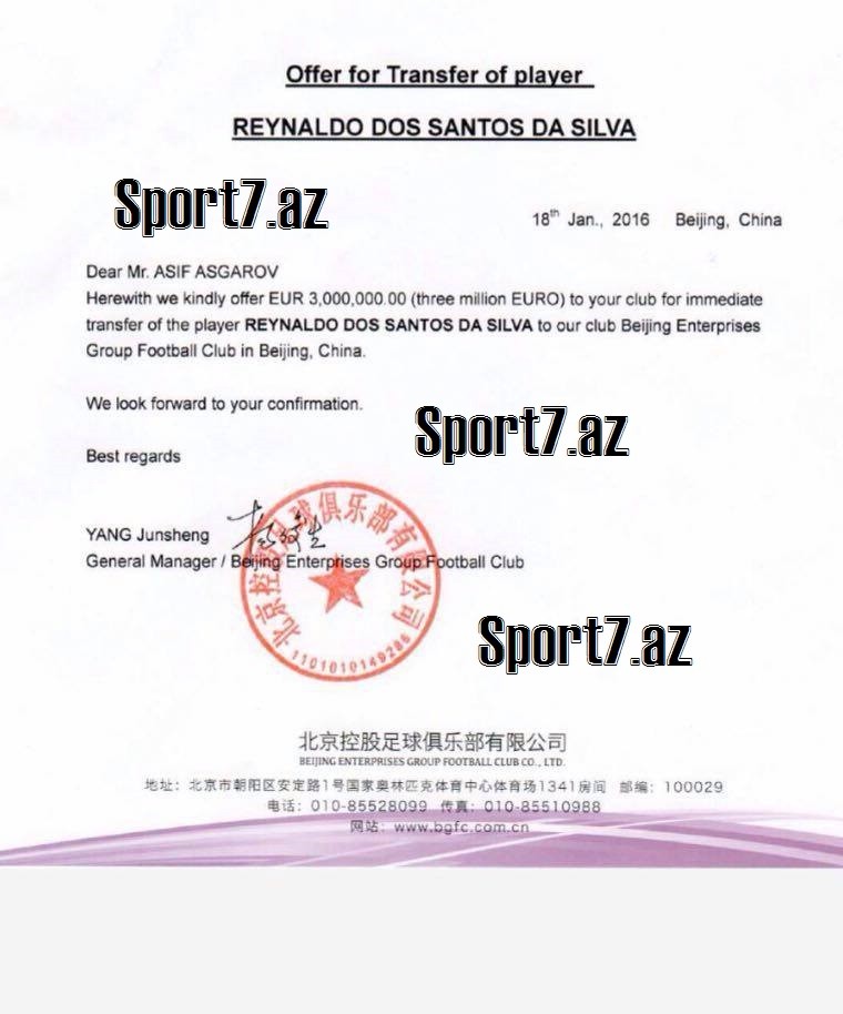 Çinlilərin 18 yanvar 2016-cı il tarixində təklif etdiyi məbləğ Azərbaycan futbolu üçün fantastik hesab edilə bilər. Bəli, asiyalılar Reynaldonu heyətinə qataq üçün "Qarabağ”a 3 milyon avro ödəməyə hazır imiş. Reynaldo da bu keçiddən daha çox qazanacaqdı. Belə ki, hər ili üçün ona 1 milyon 200 min avro ödəniləcəkdi.