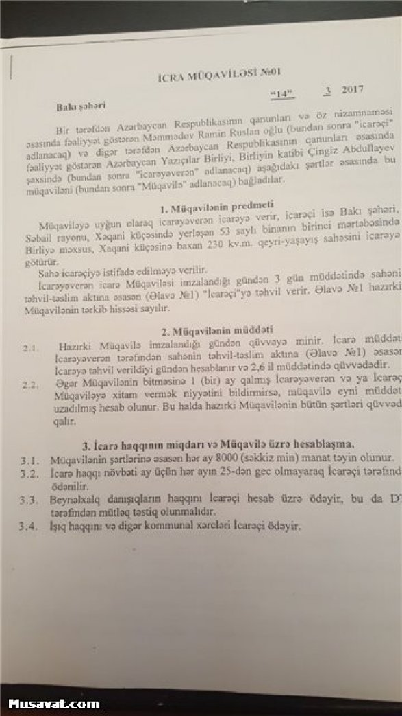 Belə ki, məkanın icarə verilməsi haqqında müqavilə icarədar Ramil Ruslan oğlu Məmmədli ilə Yazıçılar Birliyinin katibi Çingiz Abdullayev arasında bağlanıb. Tərəflər müqaviləyə öz şərt və tələblərini də əlavə edərək imza adıblar. Bu müqaviləyə görə, icarədarlar hər ay müqavilə tərəfdaşlarına 8 min manat pul verirmişlər.