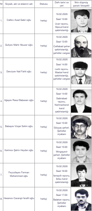 Fevralın 19-u saat 13:00-da Azad Sabir oğlu Cəlilov Ucar rayonu, Alpoud kənd qəbiristanlığında, Mahir Abuzər oğlu Quliyev isə Cəlilabad şəhər qəbiristanlığı, şəhidlər cərgəsində dəfn olunacaq. Saat 14:00-da Nail Fahil oğlu Dənziyev Lerik rayonu, Mastaıl kənd qəbiristanlığı, şəhidlər cərgəsində, Rəsul Babaxan oğlu Ağayev isə Sabirabad rayonu, Nərimankənd kənd qəbiristanlığında torpağa tapşırılacaq. Saat 15:00-da Vüqar Səlim oğlu Babayev Göyçay şəhərində yerləşən Şəhidlər xiyabanında, Şahin Heydər oğlu Kərimov isə Mingəçevir şəhərində yerləşən Şəhidlər xiyabanında, saat 16:00-da Fərman Məhəmməd oğlu Feyzullayev İsmayıllı rayonu, İstisu kənd qəbiristanlığında, saat 17:00-da isə Cavanşir İsrafil oğlu Həsənov Balakən rayonundakı Şəhidlər xiyabanında dəfn olunacaqlar.