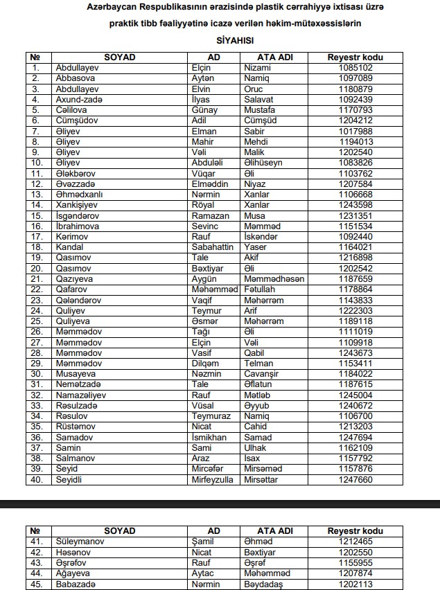 Hazırda sistemə daha 3 cərrah - Rauf Əşrəfov, Aytac Ağayeva və Nərmin Babazadənin adı əlavə edilib. Siyahıda ümumilikdə 45 plastik cərrahın adı yer alıb.