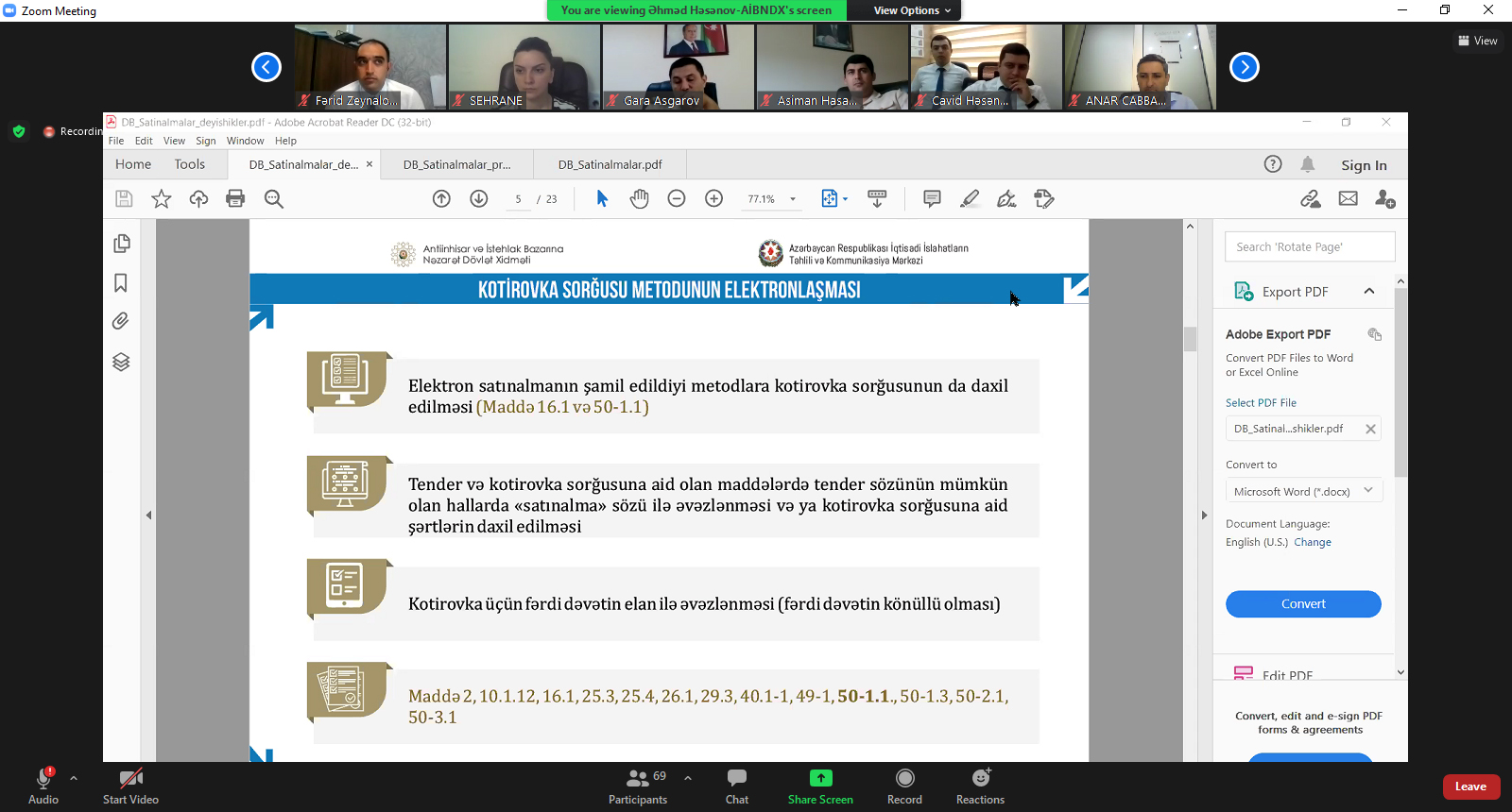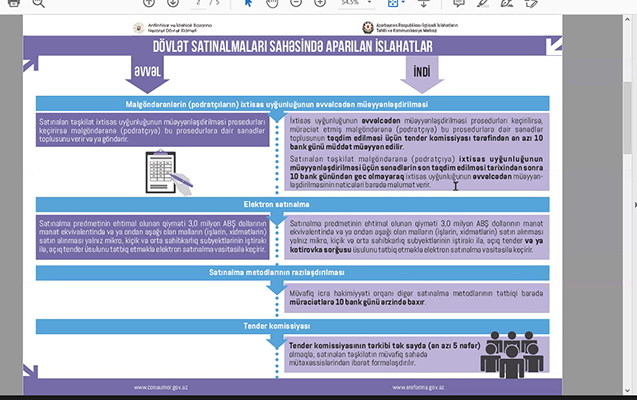 Məlum olduğu kimi, “Dövlət satınalmaları haqqında” Azərbaycan Respublikasının Qanununda dəyişiklik edilməsi barədə” Azərbaycan Respublikasının Qanunu 22 iyun 2021-ci il tarixindən qüvəyə minib. Dəyişikliklərin tətbiqi ilə əlaqədar dövlət müəssisə və təşkilatlarının satınalmalara məsul 100-ə yaxın nümayəndəsinin iştirakı ilə İqtisadiyyat Nazirliyi yanında Antiinhisar və İstehlak Bazarına Nəzarət Dövlət Xidməti tərəfindən onlayn görüş təşkil edilib.