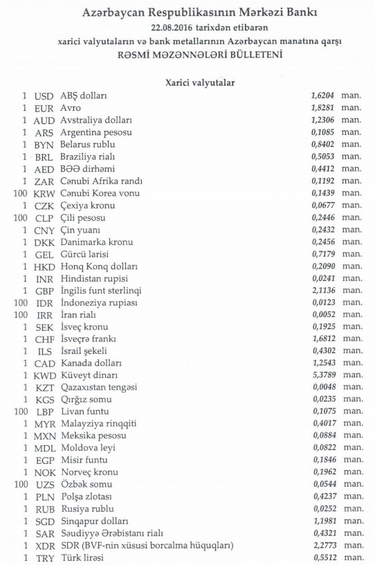 Mərkəzi Bankdan “Qafqazinfo”ya daxil olan xəbərdə bildirilir ki, bu gün üçün 1 ABŞ dollarının rəsmi məzənnəsi 1,6204 manat, 1 avronun məzənnəsi isə 1.8281 manat səviyyəsində müəyyən edilib.