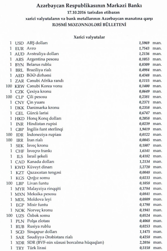 Digər valyutaların məzənnəsi ilə aşağadakı cədvəldə tanış ola bilərsiniz: