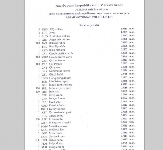 Qeyd edək ki, fevralın 21-dən Mərkəzi Bankın yeni qərarı ilə dolların məzənnəsi 1,05 manat olub, avronun məzənnəsi isə 1,1950 təşkil edib.