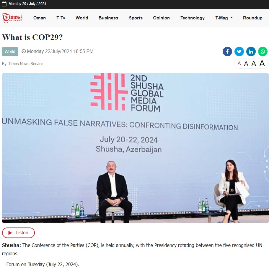 Qeyd edək ki, “Times of Oman” portalında dərc olunan “COP29 nədir” sərlövhəli məqalədə isə Azərbaycan bu ilin noyabrında BMT-nin İqlim Dəyişmələri üzrə Çərçivə Konvensiyasının Tərəflər Konfransının 29-cu sessiyasına (COP29) ev sahibliyi edəcəyi vurğulanıb. Qeyd edilib ki, beynəlxalq tədbirlərə ev sahibliyi etmək sahəsində güclü təcrübəyə malik Azərbaycan COP29-un keçiriləcəyi məkan kimi Bakı Stadionunu seçib. COP29 Sədrliyi şəffaf, qərəzsiz və inklüziv bir prosesi həyata keçirmək məqsədilə ambisiyaları artırmaq və fəaliyyətə imkan vermək üçün bir-birini gücləndirən iki sütuna əsaslanan plan hazırlayıb.