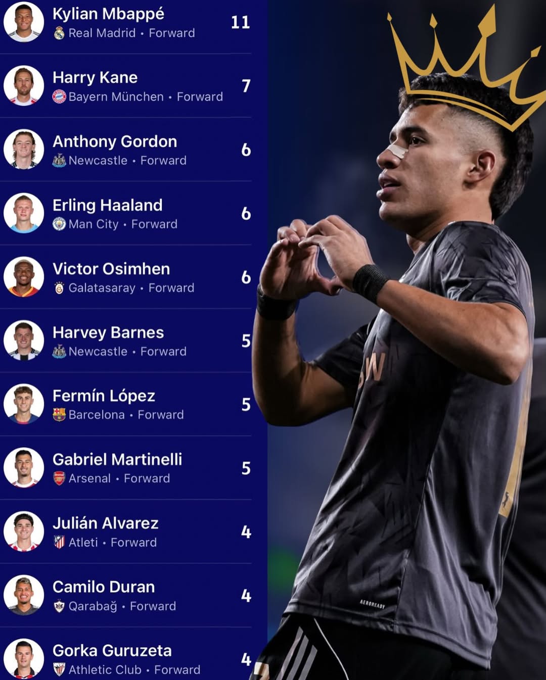 Qeyd edək ki, bombardirlər siyahısının ilk üçlüyünə “Real Madrid”in ulduzu Kilian Mbappe rəhbərlik edir. Fransız hücumçu artıq rəqib qapılarına 11 dəfə yol tapıb. İkinci pillədə 7 qolla “Bavariya”nın hücumçusu Hari Keyn, növbəti pillələrdə isə 6 qolla “Nyukasl”dan Entoni Qordon, “Mançester Siti”dən Erlinq Haaland və “Qalatasaray”dan Viktor Osimhen qərarlaşıb.