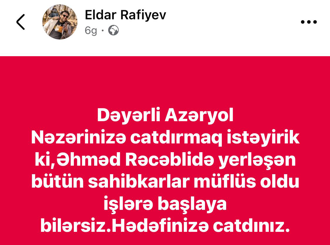 “Dəyərli Azəryol (red:AAYDA), nəzərinə çatdırmaq istəyirik ki, Əhməd Rəcəblidəki bütün sahibkarlar müflis oldu. İşlərə başlaya bilərsiniz…”, - ərazidəki məşhur iaşə obyektlərindən birinin sahibi sosial şəbəkə hesabı üzərindən etirazında bildirib.