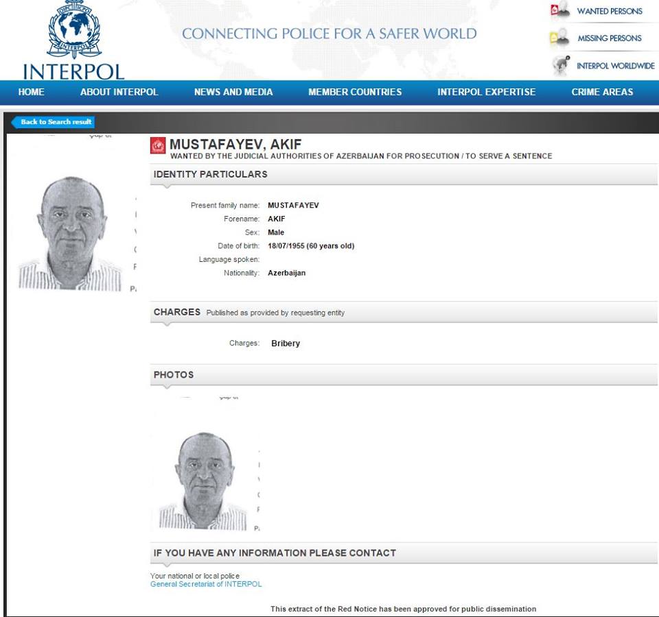1955-ci il iyulun 18-də anadan olan Mustafayev Akif İsmayıl oğlunun “İnterpol”un saytında rüşvətxorluğa görə axtarışa verildiyi qeyd olunub.