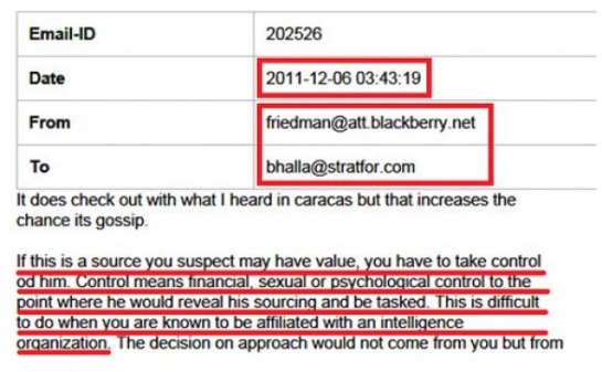 Məsələn, “Stratfor”un direktoru Corc Fridman öz analitiki, 2012-ci ildə informasiya toplamaq üçün Venesuelada ezamiyyətdə olan Reve Balleni (Reva Bhalla) buna itələyir.
