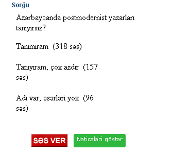 Bu gündən isə ikinci sorğuya başlayırıq. “Ən yaxşı postmodernist yazar kimdir?” sorğusunda iştirak edib oxucusu olduğunuz yazara səs verə bilərsiz, eyni zamanda istədiyiniz başqa yazarların adlarını təklif edə bilərsiz. Təklif etdiyiniz yazarların adları da sorğuya əlavə olunacaq.