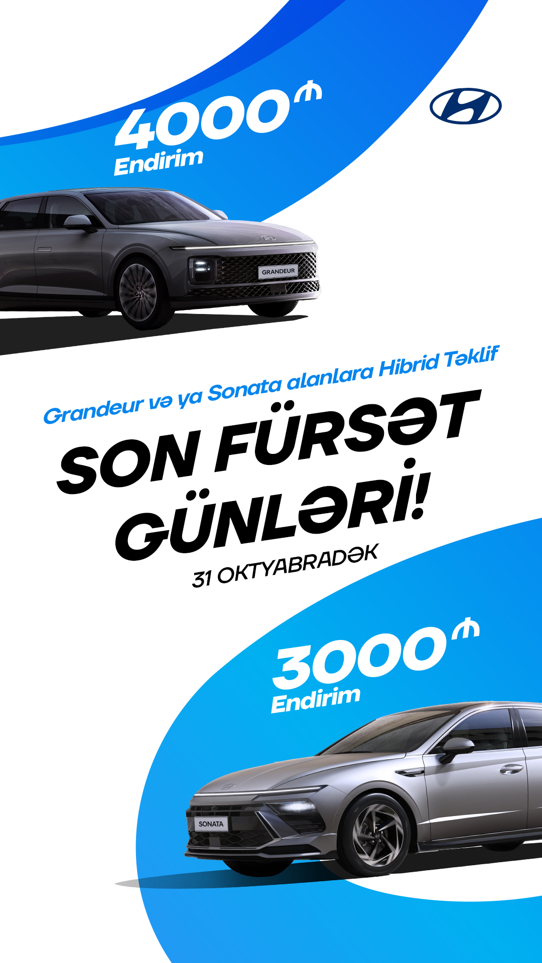“Hyundai Grandeur” hibrid modeli alanlara 4000 AZN, “Sonata” modeli alanlara isə 3000 AZN endirim təklif olunur. Bu hibrid təklif ətraf mühiti düşünən və büdcəsinə dəyər verən sürücülər üçün ideal seçimdir!