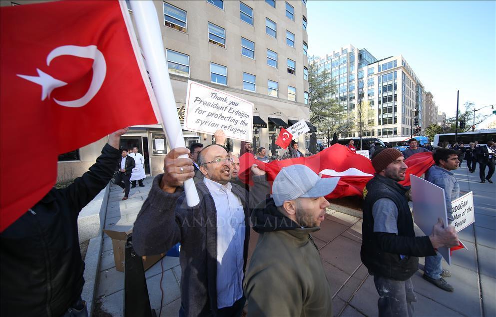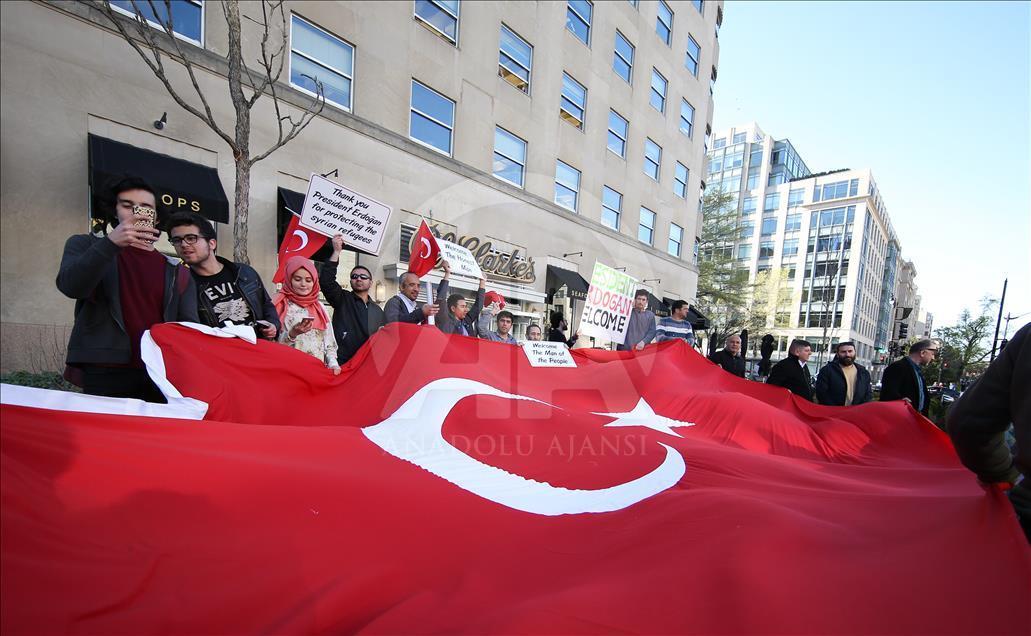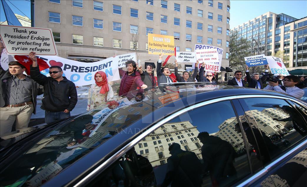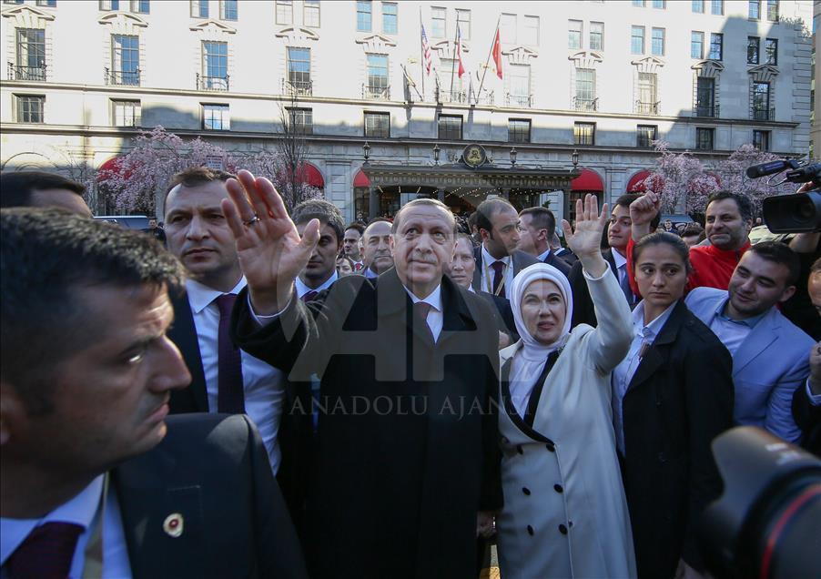“Qafqazinfo” Anadolu Agentliyinə istinadən xəbər verir ki, Vaşinqiton səfərində Ərdoğanı xarici işlər naziri Mövlud Çavuşoğlu, Türkiyənin bu ölkədəki səfiri və ABŞ-da yaşayan türklər qarşılayıb. Agentlik yazır ki, otelə gedən zaman burada yaşayan türklər “Güvenilir lider hoş geldin”, “Milletin adamı” və diğər şüarlar yazılmış plakatlar qaldırıblar.