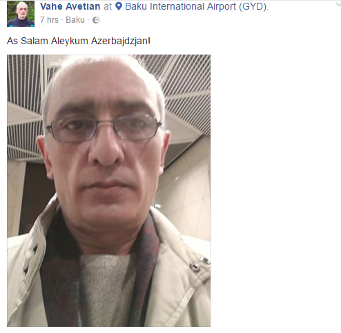 “Qafqazinfo” xəbər verir ki, Bakı aeroportunda olan Avetyan Azərbaycanı öz dilimizdə salamlamağa çalışıb: “As Salam Aleykum Azerbajdzjan!”