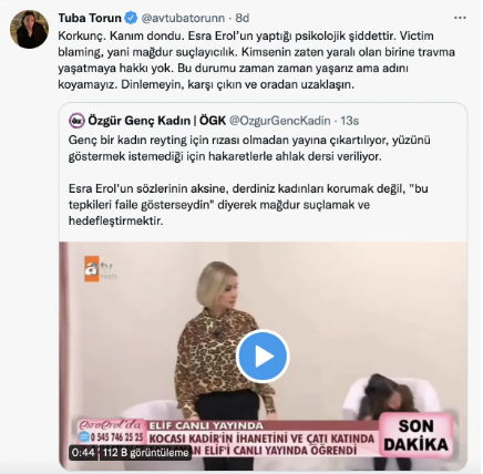 Vəkil Tuba Torun: “Qorxunc. Qanım dondu. Esra Erolun etdiyi psixoloji şiddətdir”.