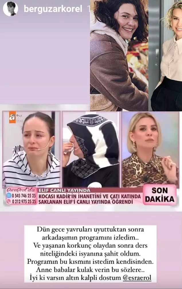 Məşhur aktrisa Bergüzar Korel isə Esra Erola dəstək olub: “Ötən gecə uşaqları yatızdırandan sonra dostumun proqramını izlədim… Və yaşanan qorxunc hadisədən sonra sənin üsyanının şahidi oldum. Proqramın bu hissəsini özündən istədim. Ana-atalar, bu sözləri eşidin… Yaxşı ki, varsan, qızıl qəlbli dostum”.