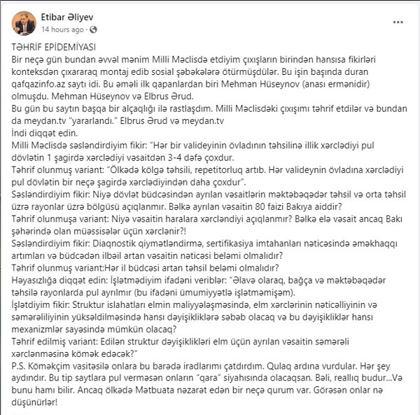 O, paylaşımında iddia edib ki, “Qafqazinfo” bundan əvvəl bir neçə dəfə deputatın fikirlərini xüsusi maraq güdərək, qərəzli şəkildə təhrif edib. O, həmçinin çıxışlarının videosunun montaj, fikirlərinin təhrif edildiyini xüsusi vurğulayıb. Ona görə də məcburuq ki, deputatın istinad etdiyi və gündəmə gəldiyi fikirləri və skrinləri oxuculara bir daha təqdim edək. Video və skrinləri təqdim edərək nəyi təhrif edib-etmədiyimizi bir daha sizdən soruşmaq istəyirik. Baxın və özünüz müəyyən edin ki, nəyi təhrif etmişik?