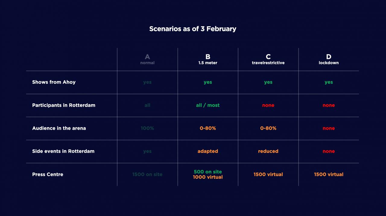 Ssenari C: Səyahət məhdudlaşdırılacaq. “Ahoy Rotterdam”da tamaşaçı sayı məhdud olacaq. Tamaşaçılar 0 ilə 80 faiz arasında olacaq. Niderlanda gələ bilməyən nümayəndələr öz ölkələrindəki studiyalarda çıxış edəcəklər. Mətbuat mərkəzi rəqəmsal şəkildə aparılacaq və 1500 nəfər layihəyə cəlb ediləcək.