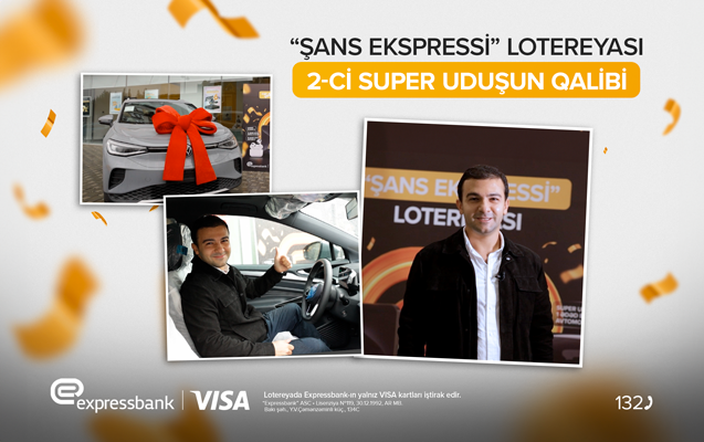 “Expressbankın” VISA kart istifadəçiləri üçün keçirdiyi “Şans Ekspressi” lotereyasında II rübün FİNAL tirajı üzrə super uduşun sahibi müəyyən olunubb. Qalib Volkswagen ID4 Pure+ markalı elektrikli avtomobil udub. Hədiyyənin təqdimolunma mərasiminə buradan baxa bilərsiniz.