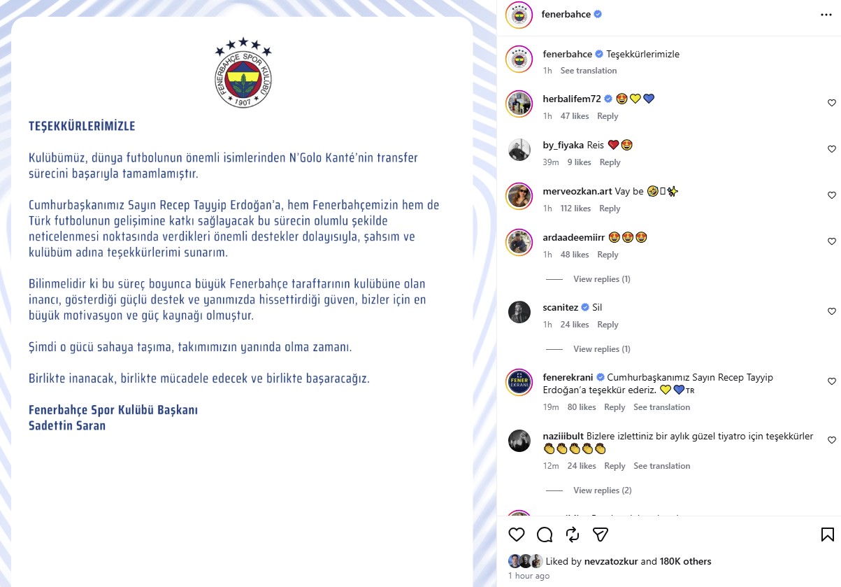 “Fənərbaxça” Nqolo Kantenin transferi üçün Türkiyənin prezidenti Recep Tayyib Ərdoğana təşəkkür edib.