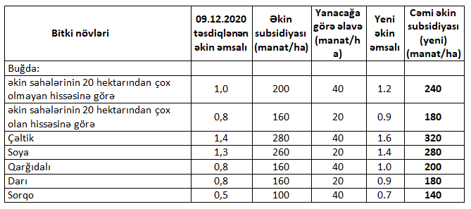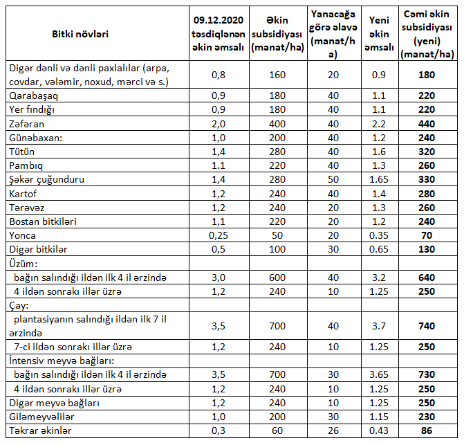 Aqrar Subsidiya Şurasının qərarına əsasən, 2021-ci ildə kənd təsərrüfatı bitkiləri üzrə yeni əkin əmsalları və əkin subsidiyasının məbləği aşağıdakı kimi müəyyən edilib: