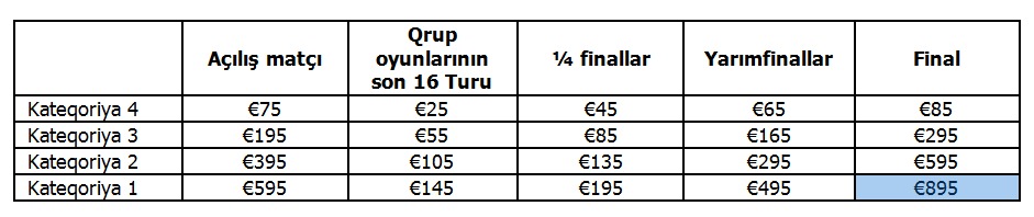 Qrup matçları üçün biletlərin qiyməti 25 – 145 avro arasında dəyişir.