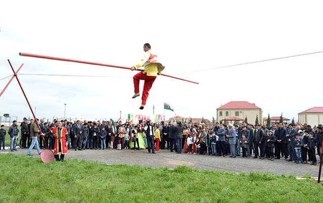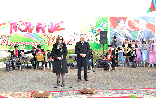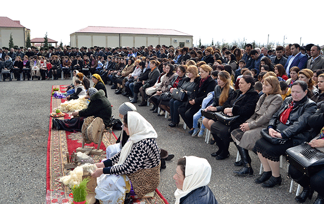 Rayon İcra Hakimiyyətinin başçısı Alı Alıyev və Bahar Muradova əvvəlcə Novruza aid adət-ənənələri özündə əks etdirən sərgiyə baxıblar. Milli adət-ənənələrimizə uyğun olaraq meydanda yun daranıb, nehrə çalxalanıb, sacda yuxa bişirilib.