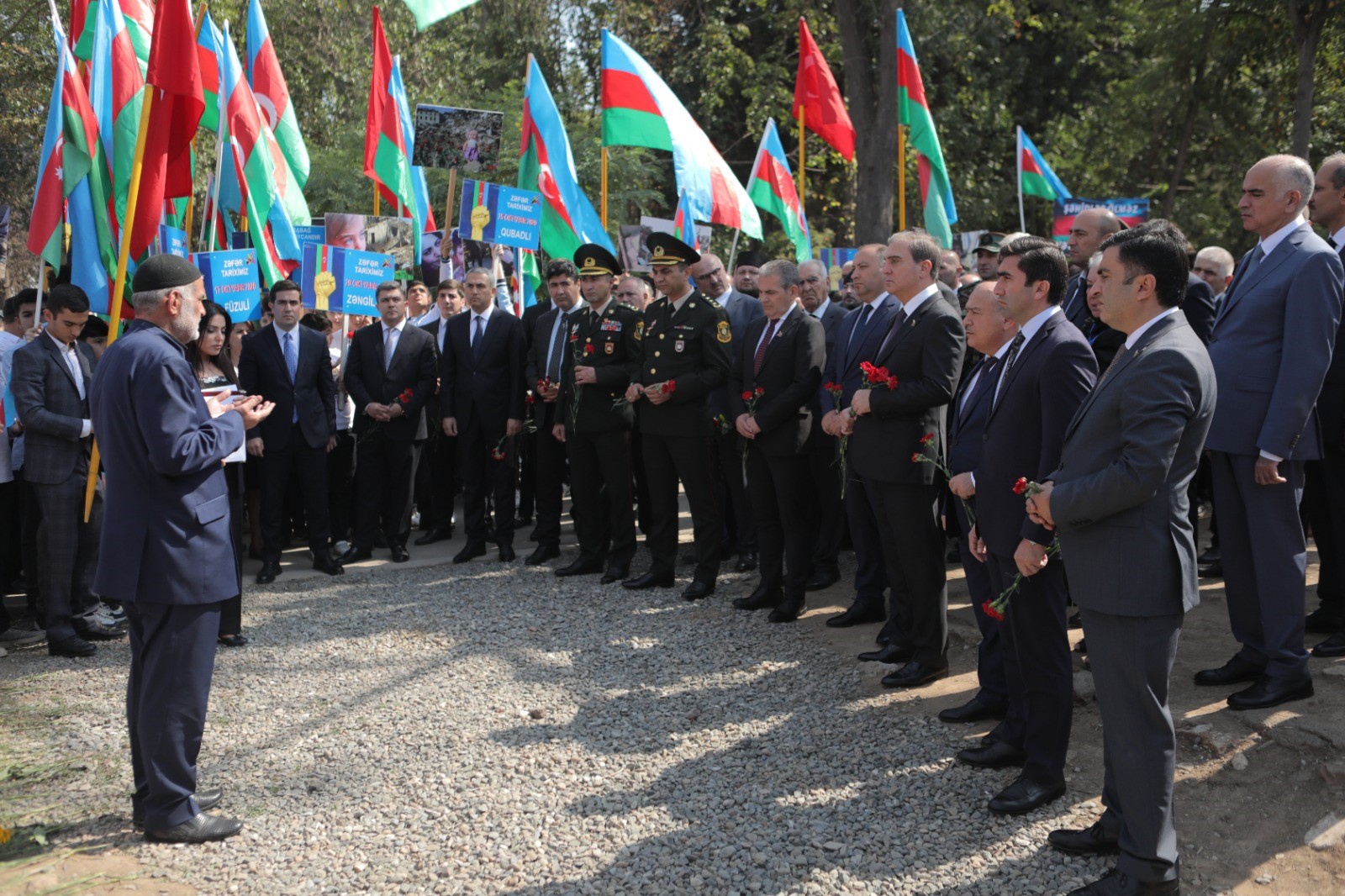 Daha sonra rəsmilər Vətən müharibəsi zamanı Ermənistan silahlı qüvvələrinin Gəncəni raket atəşinə tutması nəticəsində dağılan ərazini ziyarət edib, burada həlak olan mülki şəhidlərin şəkil və məlumatlarını əks etdirən lövhəyə baxış keçiriblər. Rəsmilər onların xatirəsinə ehtiram əlaməti olaraq əraziyə gül dəstələri düzüblər.