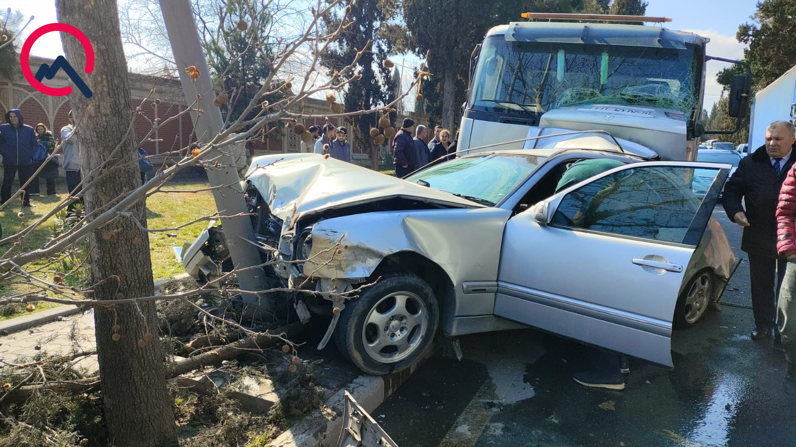 Zərbənin təsirindən minik avtomobillərindən biri yoldan çıxaraq işıq dirəyinə çırpılıb.