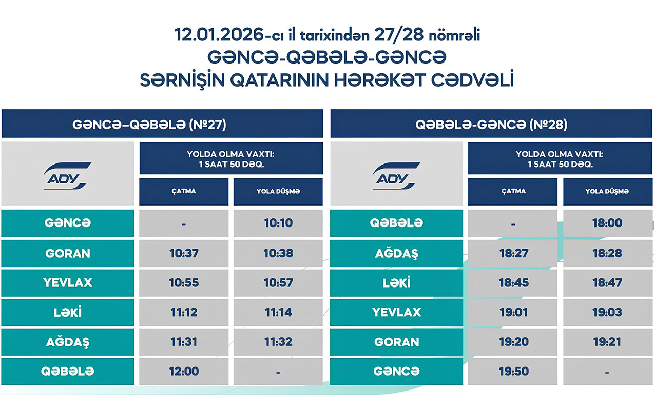 12 yanvar 2026-cı il tarixindən fəaliyyətə başlayacaq Gəncə–Qəbələ–Gəncə marşrutu üzrə qatarların hərəkət qrafiki açıqlanıb.