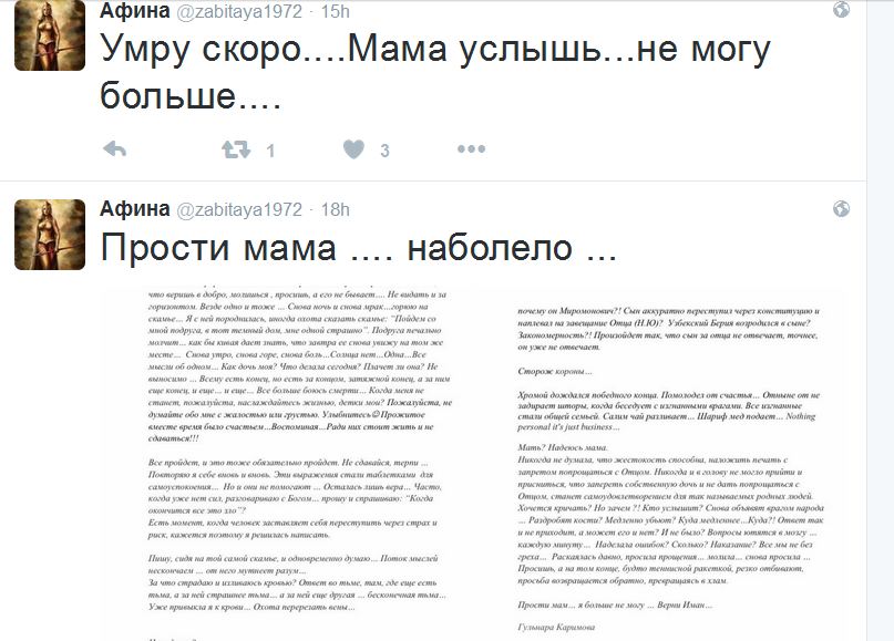 “Qafqazinfo” xarici KİV-ə istinadən xəbər verir ki, Afina adlı istifadəçi artıq sözügedən hesabla iki məktub paylaşıb. O, ilk məktubunda anasına müraciət edərək “Tezliklə öləcəyəm... Eşit ana... Daha bacarmıram” yazıb.