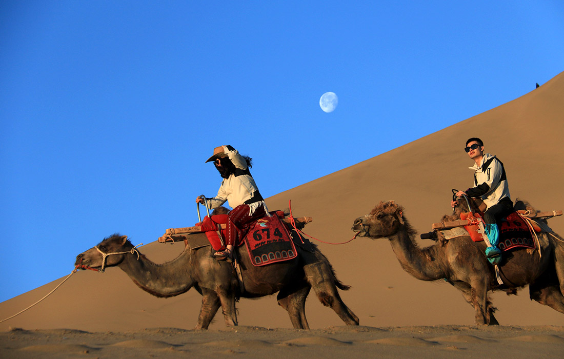 Turistlər Çinin Jiuquan bölgəsindəki Mingsha dağında dəvələrə minirlər.