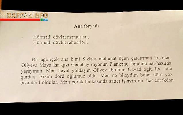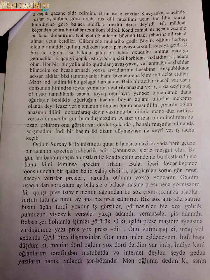 “Qafqazinfo”ya daxil olan müraciətdə M.Əliyeva oğlu S.Əliyevdən imtina etdiyini, onun haram pul qazandığını, özünün dediyi kimi “xox gələrək pul aldığını” bildirib: “Bir gün özü kimi dostları ilə bahalı maşınlarla kəndə gəlmişdi. Qonşuluqda olan bir qadın gəlib soruşdu ki, uşaqlar presi neçəyə verirlər, ot yoxsa yonca presidir. Oğlanlarıma dedim ki, siz o balaca maşına presi necə yığımısız, qonşu gəlib pres istəyir. Dedilər “ay ana biz pres satmırıq, söz satırıq. Bizim üçün fərqi yoxdur iş görsünlər, ya görməsinlər. Biz xox gəlirik, pulumuzun yiyəsiyik. Versələr, yaxşı adamdılar, verməsələr pis. Beləcə şər böhtanla işimizi görürük”.
