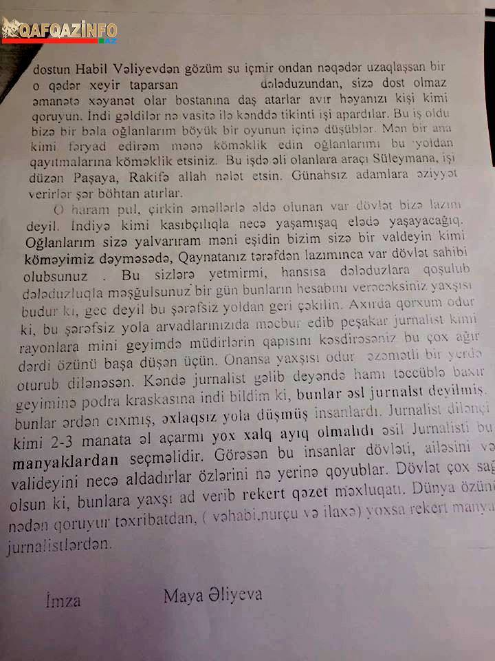 İnsanların gizli yollarla intim videolarını çəkib şantaj etməklə ittiham olunan reket jurnalist, “Bizim dövr” qəzetinin baş redaktoru Surxay Əliyevin anası Maya Əliyeva müvafiq qurumların rəhbərliyinə şok effekti yaradacaq məktub yazıb.