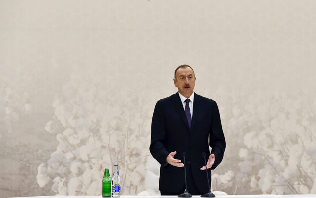 Azərbaycan prezidenti bəyan edib ki, dünyada neftin qiymətinin düşməsi ilə bağlı bizim gəlirlərimiz də azalıb: "Əgər qiymət üç-dörd dəfə düşürsə, gəlirlər də üç-dörd dəfə azalır. Biz Azərbaycana valyuta axınını təmin etməliyik. Ona görə, ixracyönümlü məhsulların istehsalı xüsusi əhəmiyyət daşıyır. Pambıq da ixracyönümlü məhsuldur. Təsadüfi deyil ki, pambığa “Ağ qızıl” deyirlər. Bu il pambıqçılığın bərpasının birinci ilidir. İndi statistikaya baxdıqda göz önünə çox acınacaqlı mənzərə çıxır. Əgər Ulu Öndərin yorulmaz səyləri və zəhmətkeşlərin böyük fədakarlığı nəticəsində 1970-80-ci illərdə bir milyon ton pambıq tədarük edilirdisə, keçən il cəmi 35 min ton yığılıb. Əgər o illərdə 300 min hektarda pambıq əskilirdisə, keçən il cəmi 18 min hektarda pambıq əkilib. Bu, nə deməkdir?! Bu, pambıqçılığın məhvi deməkdir. Bu, dözülməzdir və artıq ciddi tədbirlər görülür. Düzdür, biz bu il bir az gecikmişik. Ancaq bu il yenə də yaxşı nəticələr gözlənilir. Bu gün burada rayonlar üzrə çıxış edənlər məruzələrində deyəcəklər. Bu il bütövlükdə 51 min hektar sahədə pambıq əkilib. Keçən illə müqayisədə bu, təxminən üç dəfə çoxdur.