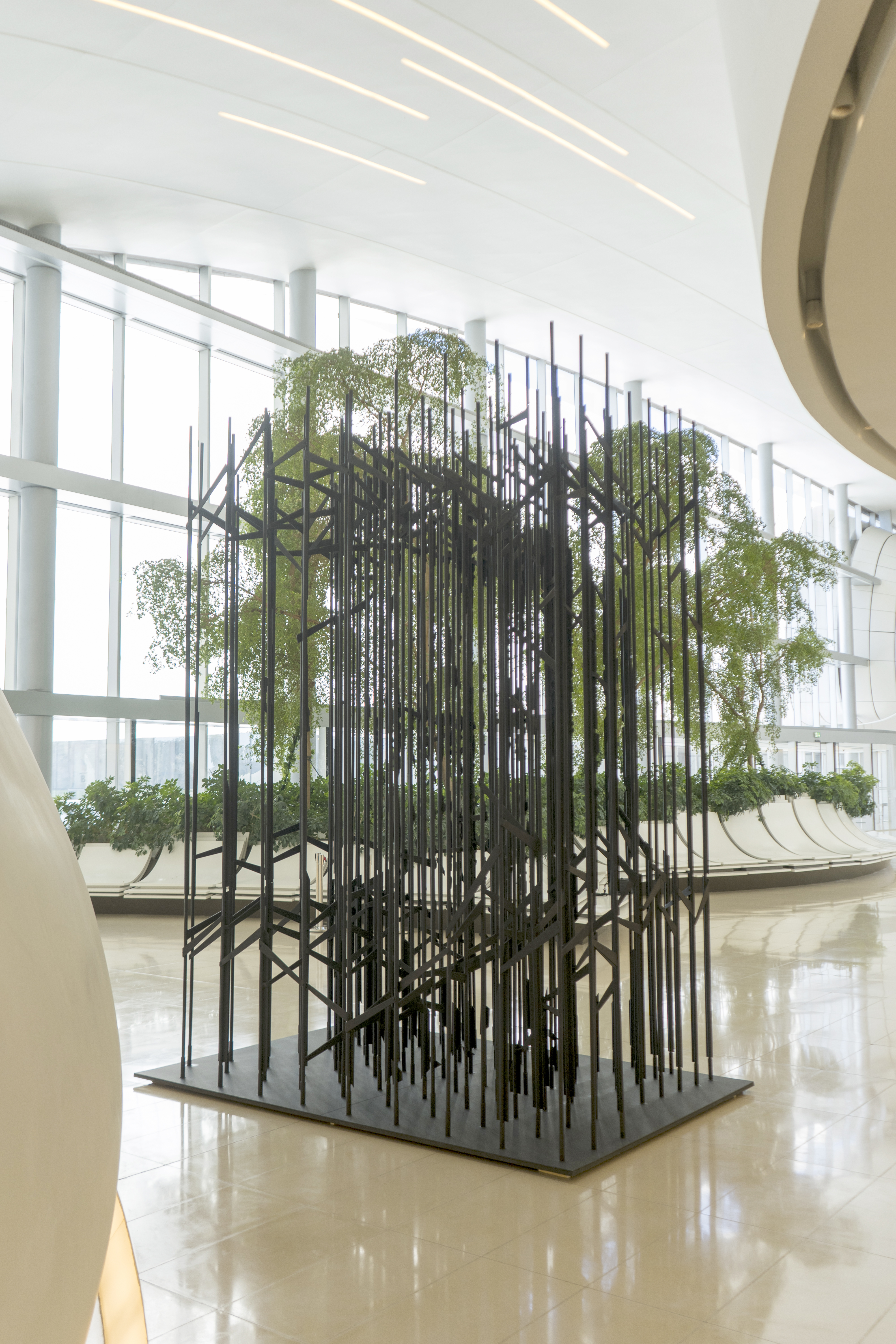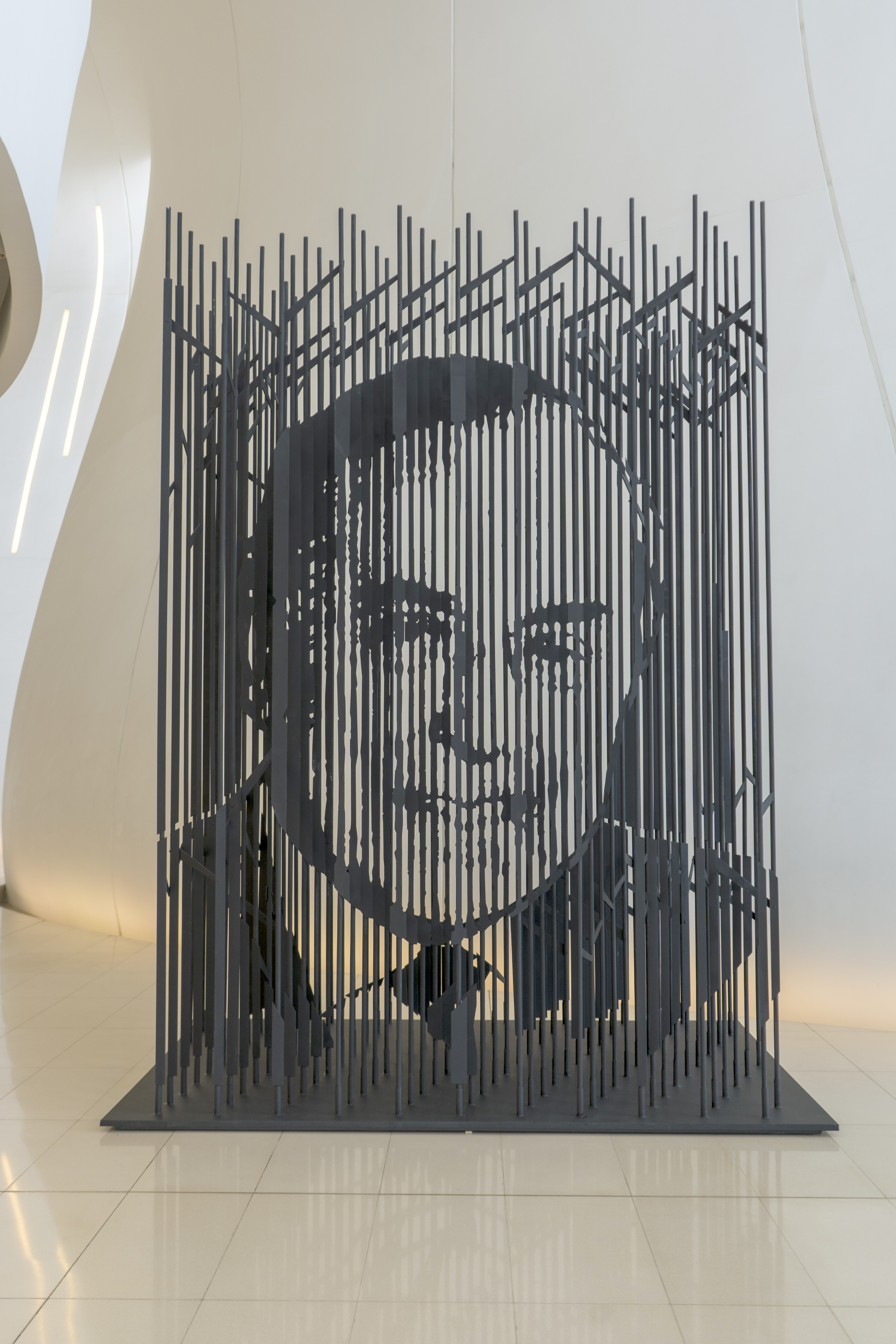 “Heydər Əliyev – 100” instalyasiyasının müəllifi, Əməkdar rəssam Rəşad Ələkbərov çıxış edərək vurğulayıb ki, əsər XX əsrin ikinci yarısından etibarən beynəlxalq incəsənət məkanında geniş yayılmaqda olan “op-art” cərəyanı ruhunda ərsəyə gətirilib. Altı ay ərzində hazırlanan kompozisiya Ulu Öndər Heydər Əliyevin portretini canlandırır. Əsərdə Ümummilli Lider Heydər Əliyevin 100 illik yubileyinin rəmzi olaraq bədii vasitə kimi istifadə edilən 100 dirəyin “işığı” dahi şəxsiyyətin əbədiyaşarlılığını ifadə edir.