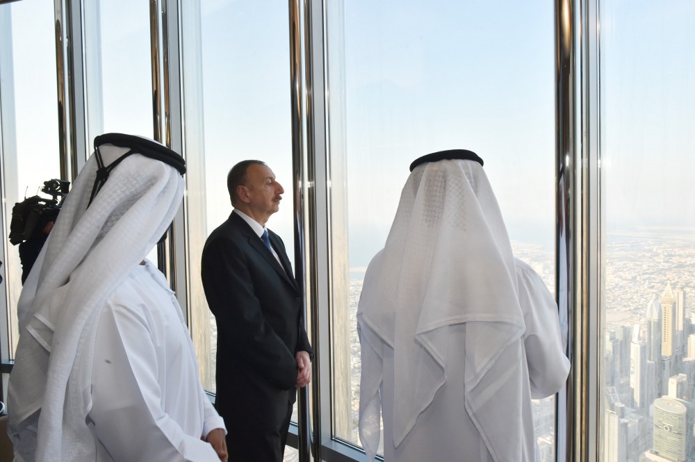 Dövlət başçısına məlumat verilib ki, dünyanın ən böyük göydələni olan “Bürc-Xəlifə”nin tikintisi 2004-2009-cu illərdə həyata keçirilib. 2010-cu ildə binanın möhtəşəm açılışı olub. Əvvəllər “Bürc-Dubay” adlandırılan 165 mərtəbəli bu möhtəşəm tikilinin hündürlüyü 828 metrdir. Binanın 150-ci mərtəbəsindən sonrakı hissələrinin tikintisində polad konstruksiyalardan istifadə olunub. Bununla da “Bürc-Xəlifə” dünyada ilk dəfə beton kütlə üzərində polad konstruksiyalardan istifadə olunan tikili kimi tarixə düşüb.