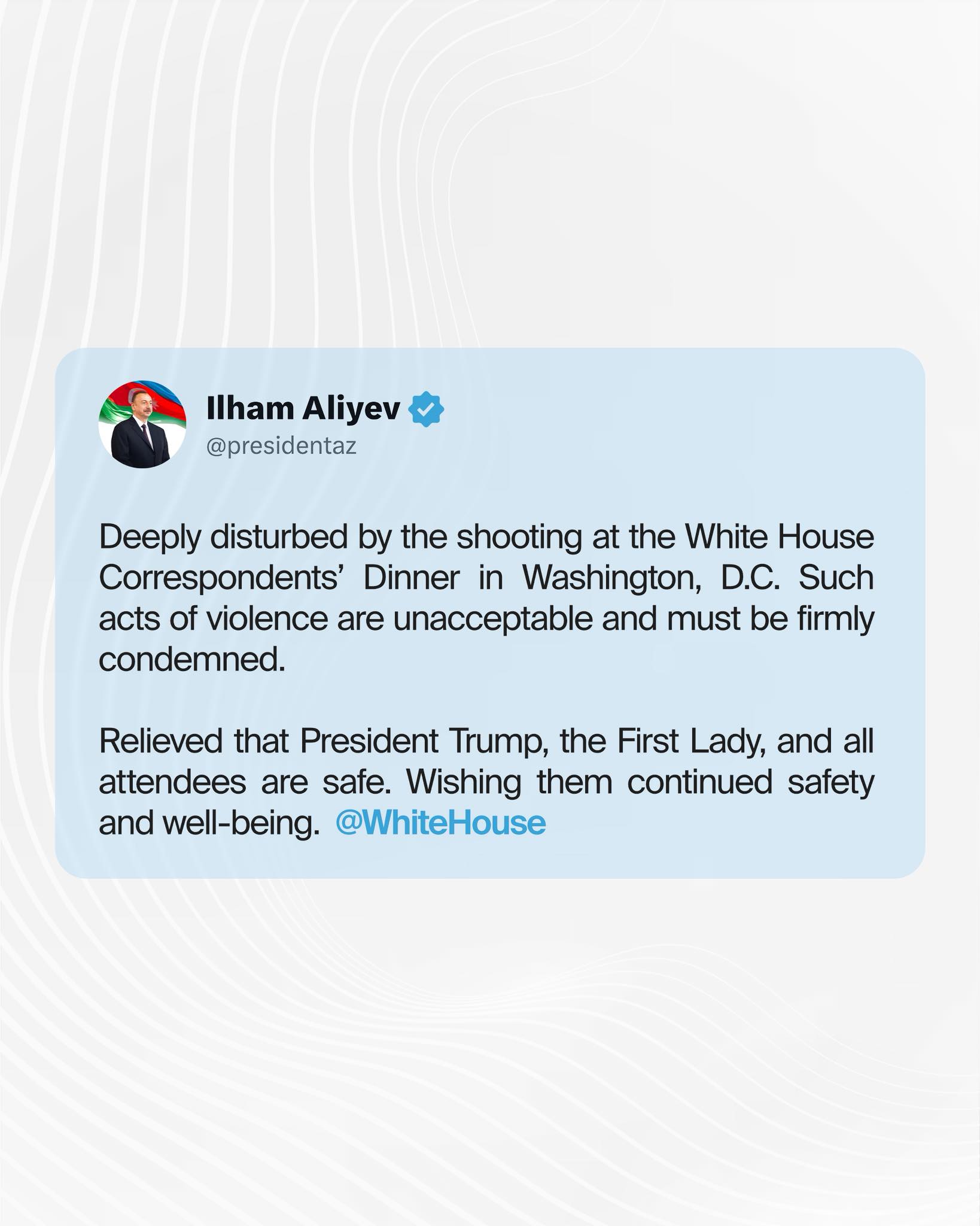 “Belə zorakılıq halları qəbuledilməzdir və qəti şəkildə pislənməlidir. Prezident Trampın, Birinci xanımın və bütün iştirakçıların təhlükəsiz olması sevindiricidir. Onlara davamlı təhlükəsizlik və rifah arzulayıram”, - deyə Dövlət başçısı vurğulayıb.