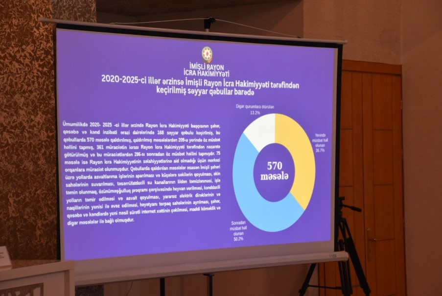 Giriş nitqi ilə çıxış edən icra başçısı Ulu Öndər Heydər Əliyev tərəfindən formalaşdırılmış və ölkəmizin davamlı inkişafını təmin edən dövlət idarəetmə modelinin Prezident İlham Əliyevin rəhbərliyi ilə müasir dövrün tələblərinə uyğun şəkildə uğurla davam etdirildiyini vurğulayıb. O, 2025-ci il ərzində İmişli rayonunda iqtisadiyyat, kənd təsərrüfatı, sənaye, məşğulluq, sosial müdafiə, təhsil, səhiyyə, infrastruktur, abadlıq-quruculuq və kommunal xidmətlər sahələri üzrə görülmüş işlər, həyata keçirilmiş layihələr və əldə olunmuş nəticələr barədə ətraflı məlumat verib. Çıxış zamanı vətəndaş müraciətlərinin qəbulu, araşdırılması və operativ həlli istiqamətində görülmüş tədbirləri, müraciətlərin say dinamikasını və onların həll səviyyəsini xüsusi vurğulayıb, eyni zamanda rayonun sosial-iqtisadi inkişaf perspektivlərini və 2026-cı ildə qarşıda duran əsas vəzifələri diqqətə çatdırıb.