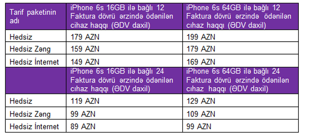 Tarif paketinin adı iPhone 6s 16GB ilə bağlı 12 Faktura dövrü ərzində ödənilən cihaz haqqı (ƏDV daxil) iPhone 6s 64GB ilə bağlı 12 Faktura dövrü ərzində ödənilən cıhaz haqqı (ƏDV daxil)