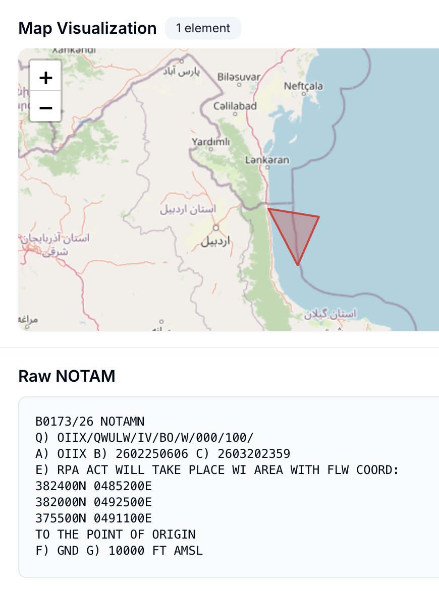 Bildiriş elanına səbəb qeyd olunan ərazidə yer səviyyəsindən 10.000 futa (təxminən 3050 metr) qədər yüksəklikdə pilotsuz uçuş aparatlarından (PUA) istifadədir. Həmin saatlarda bölgədə İslam İnqilab Keşikçiləri Korpusunun PUA-larının intensiv uçuşları qeydə alınıb.