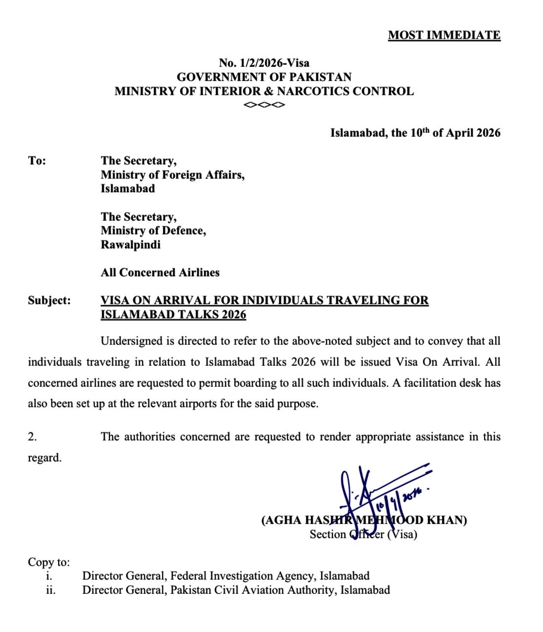 “Bu məqsədlə bütün aviaşirkətlərdən xahiş olunur ki, bu şəxslərə vizasız şəkildə təyyarəyə minməyə icazə versinlər. Pakistanın miqrasiya orqanları onlara ölkəyə daxil olduqda viza (Visa on Arrival) təqdim edəcək”, - o qeyd edib.