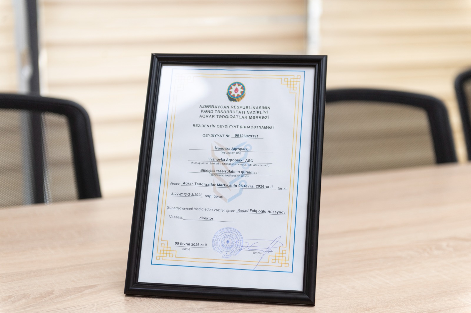 Tədbirin sonunda ATM direktoru Rəşad Hüseynov rezidentin qeydiyyat şəhadətnaməsini “İvanovka Aqropark”ın direktoru Ramin Əlifova təqdim edib.