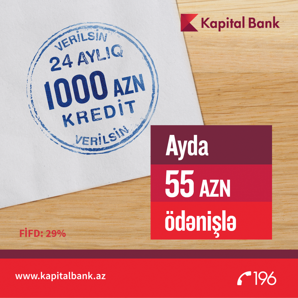 Kapital Bank müştərilərə ayda cəmi 55 manat ödəməklə, 1000 manat nağd pul krediti təklif etməkdə davam edir. Kreditin müddəti 24 ayadək rəsmiləşdirilə bilər.