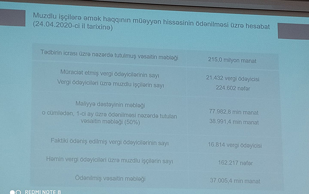 Muzdlu işçilərin əmək haqqının müəyyən hissəsinin ödənilməsi üzrə aprelin 24-nə olan hesabata görə, tədbirin icrası üzrə nəzərdə tutulmuş vəsaitin məbləği 215 milyon manatdır. 21 432 vergi ödəyicisi müraciət edib, onların 224 602 nəfəri muzdlu işçilərdir. Maliyyə dəstəyinin məbləği 77.982.8 min manatdır. O cümlədən, 1-ci ay üzrə ödənilməsi nəzərdə tutulan vəsaitin məbləği (50%) 38.991.4 min manatdır. 16 814 vergi ödəyicisinə faktiki olaraq ödəniş edilib. Həmin vergi ödəyicilərindən 162 217 nəfəri muzdlu işçidir. Ödənilmiş vəsaitin məbləği isə 37.005.4 min manatdır.