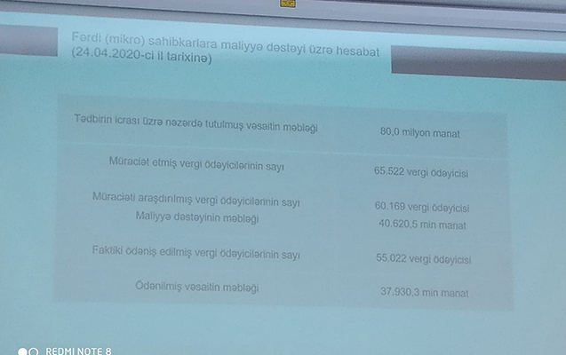 Fərdi sahibkarlara maliyyə dəstəyi üzrə 24 aprel tarixinə olan hesabata görə, tədbirin icrası üzrə nəzərdə tutulmuş vəsaitin məbləği 80 milyon manatdır. 65 822 vergi ödəyicisi müraciət edib. Onlardan 60 169 nəfərinin müraciəti araşdırılıb və 40 620.5 min manat maliyyə dəstəyi edilib. Faktiki ödəniş edilmiş vergi ödəyicilərinin sayı 55 022 nəfərdir. Ödəniş vəsaitinin məbləği isə 37.930.3 min manatdır.